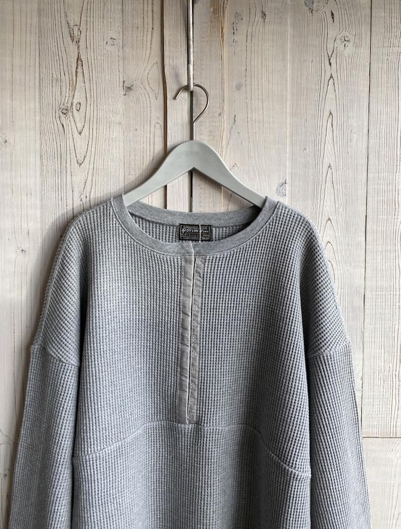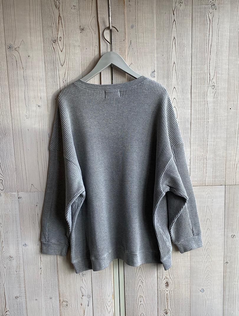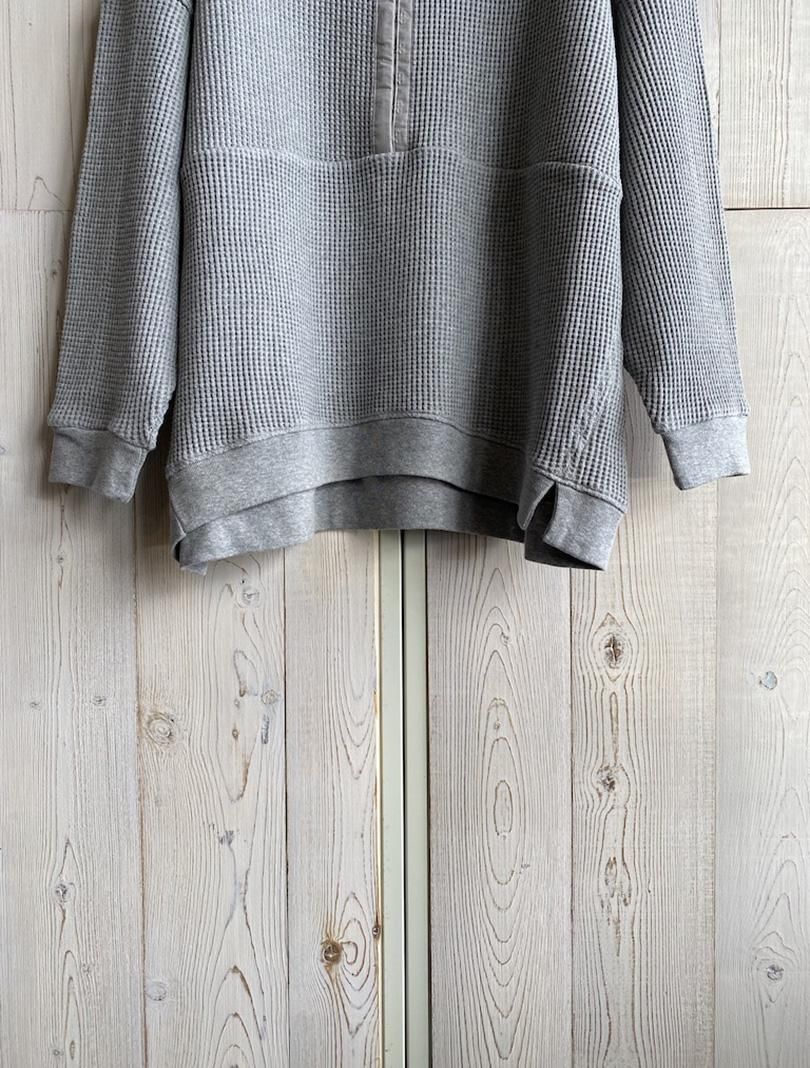REACよりワッフルホックプルオーバーです。シンプルに見えてどこか違うのが◎ ヘンリーの様なネックがあえてテーピングでフックになっていたり、ドロップショルダーのオーバーサイズも雰囲気があります。メンズライクの様でフェミニンなシルエットがまた良いです。