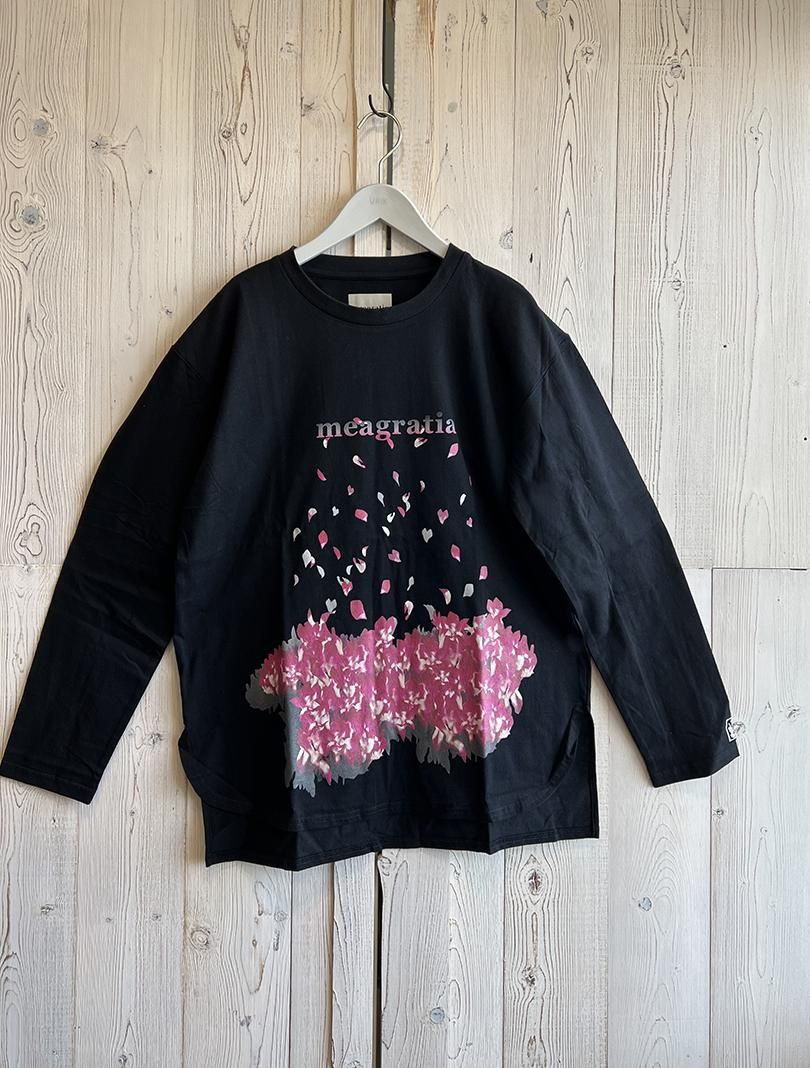 meagratiaよりプリントロングスリーブTシャツです。触りの良いコットンで、フロントのラウンドとバックのスクエアが特徴なTシャツ。機能的にもサイドスリットのポケットの使いやすさを考えられています。プリントはファイヤーパターンから着想したフラワーパターンはシクラメンの花を重ねて表現したデザインです。