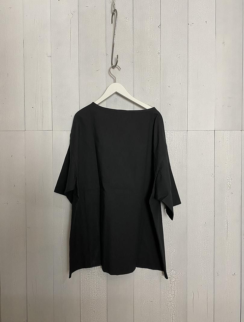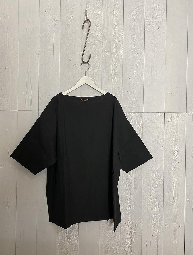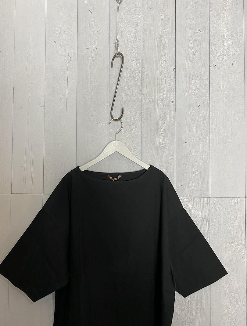 roundabout よりH / Sダブルボートネックプルオーバーです。他の生地にはない柔らかさと膨らみを出すため、このアイテムを作る工程において生地を揉み込むといった加工を施したコットン・ローンを二重で使用しています。袖口や裾を輪っかの仕様にしてあり、できる限り表にステッチを見せないシームレスの作りも拘りです。春夏シーズンということで薄さにも拘り、二重に使用していながら着用時に重さや暑苦しさを感じないよう工夫しています。袖は5分丈で袖口は広くなっている為、袖を折って着用すると雰囲気あります。ゆったりとした雰囲気と着心地を楽しむプルオーバーです。
