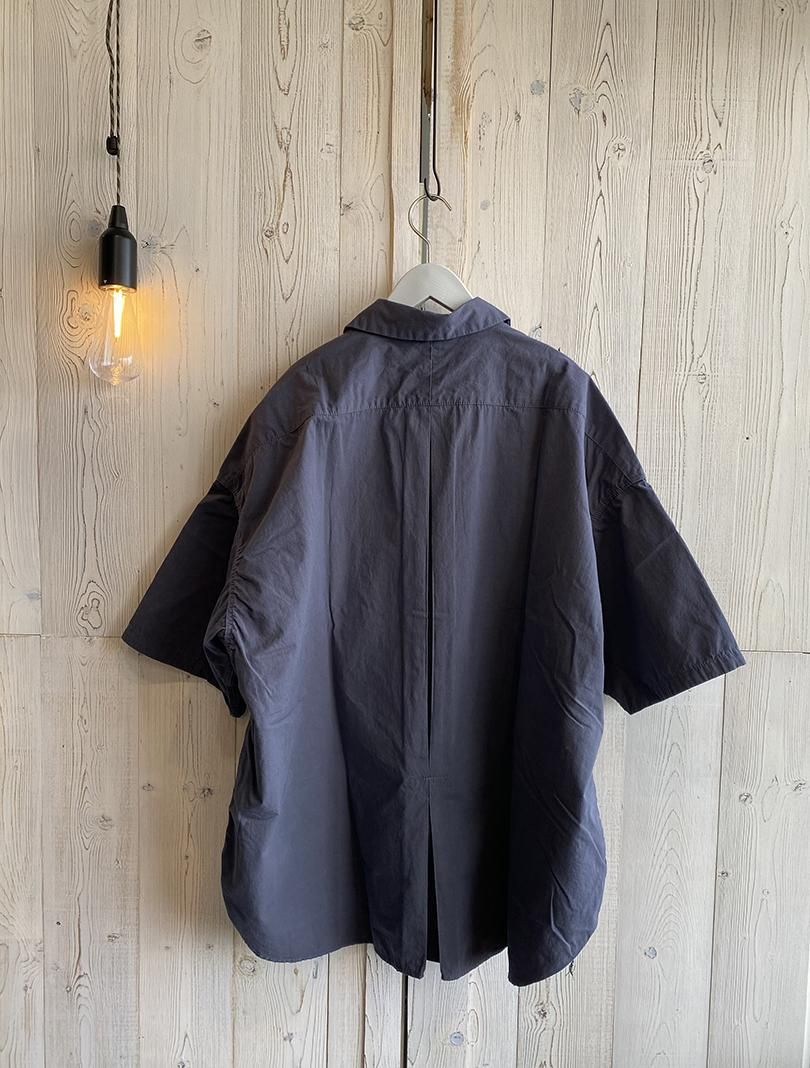 滋賀県愛荘で培われた近江晒(漂白効果と生地を柔らかくする効果がある灰汁を用いて生地を柔らかく、染めやすくするための加工技術)で生機をゆっくり揉みほぐし、生地の膨らみとナチュラルなシボ形状が特徴の生地にさらに反発加工をプラスし、弾力のあるハリが上質な風合いを醸し出しているコットン・プロードを使用したシャツです。アームホールや脇、袖下だけは2一般的にはシャツに使用しないような太い糸を用いて、パッカリングを起こさせるために敢えてシャツ工場ではなくデニム工場にて巻き縫いで生産しました。胸ポケットにはサングラスを入れやすいように、ポケットの上にループが付いています。ループを通してポケットに入れて頂くとサングラスが横にグラグラ動かず、便利です。色も紫がかったような絶妙なグレーで細部に渡ってのこだわりが良いです。