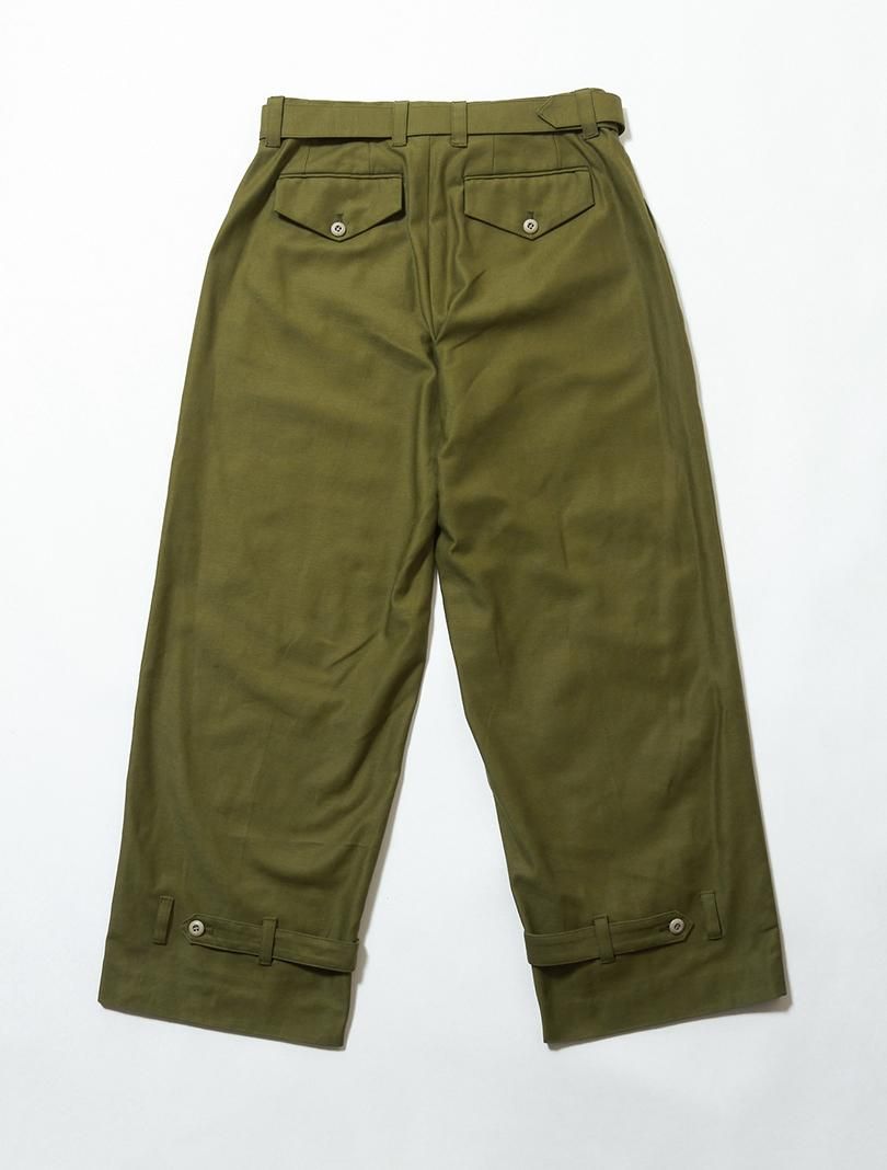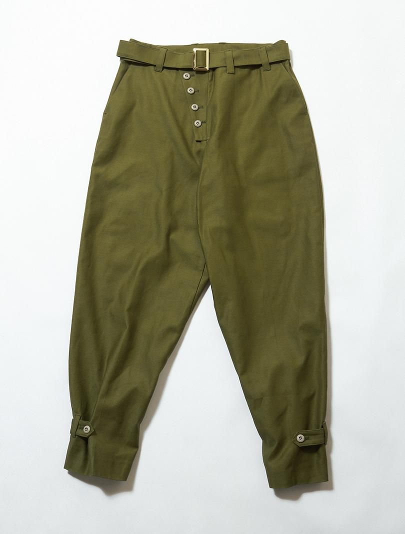 イタリアンミリタリーディティールを取り入れたワイトパンツです。フロントの斜めボタンとウエストベルトがポイント。ウエストにはサテンコードが入っており サイズ調整が可能です。裾のボタン位置を変えることでパンツのシルエットを変えて2wayでの着こなしをお楽しみいただけます。