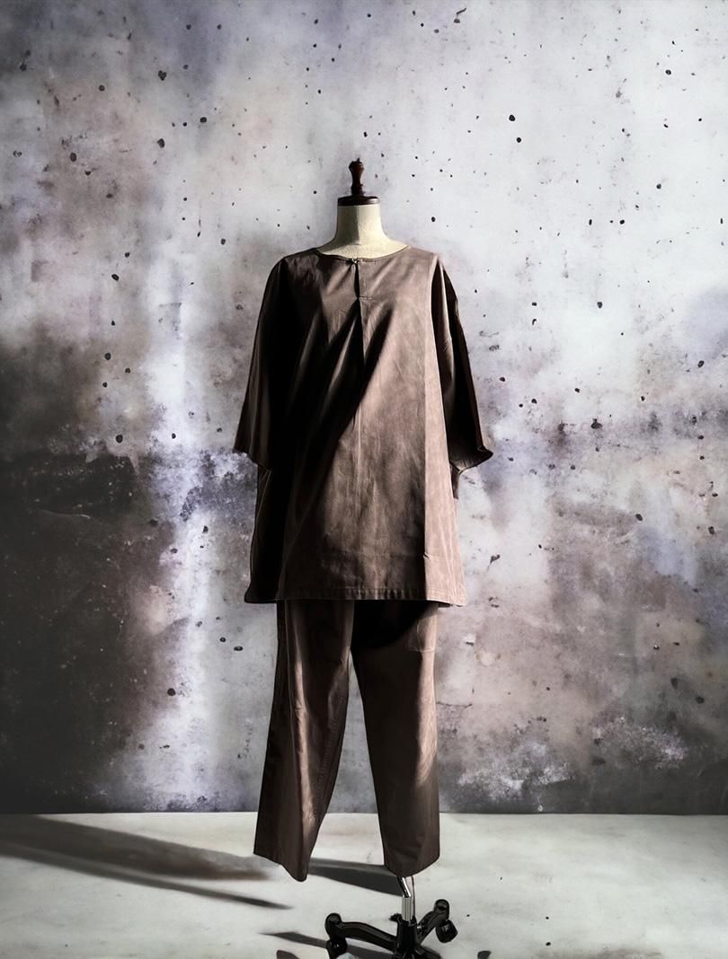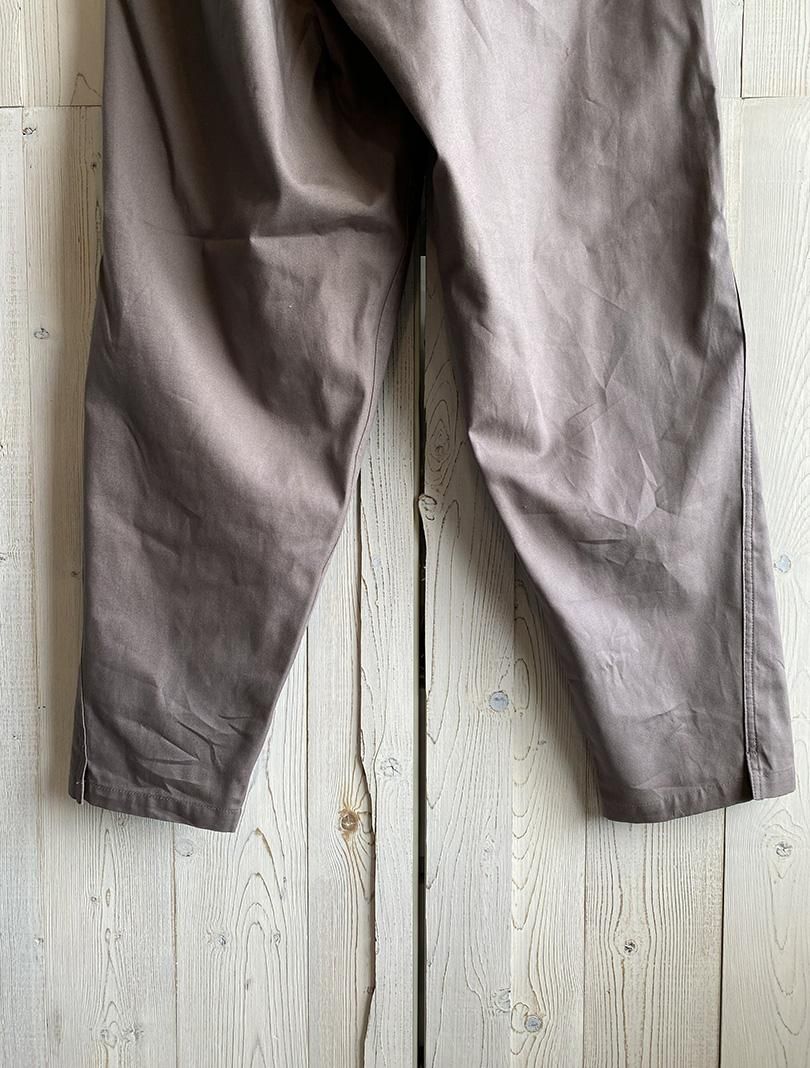 光沢があり織目がはっきりしているのが特徴で、さらにはソフトな肌触りで通気性が良く、シワになりにくくて文夫なコットン・オックスフォードを使用しています。ヒップやワタリのサイズバランスは大きめに設定し、そこから裾にかけて一気にテーパードをかけたシルエットになっています。脇部分の生地を重ね合わせることによって後ろ身頃がポケットの袋代わりになっている前ポケットの作りもポイントです。サイズ3の為かなりのオーバーサイズです。雰囲気を楽しんで下さい。