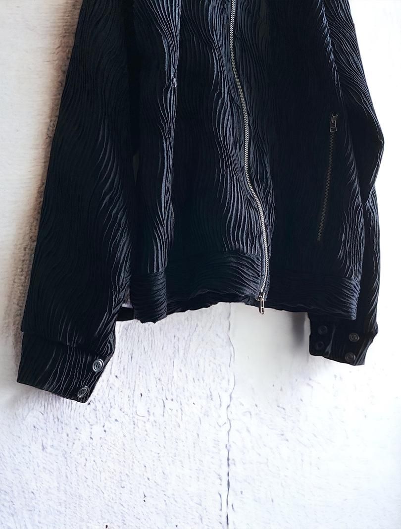 トラックジャケットを品のあるイメージに昇華したブルゾン。袖口をカフス仕様にし、動きやすさとデザイン性を持たせています。オリジナルの水面のように波打つ表情が独特の生地は伸縮性があり柔らかい着心地です。