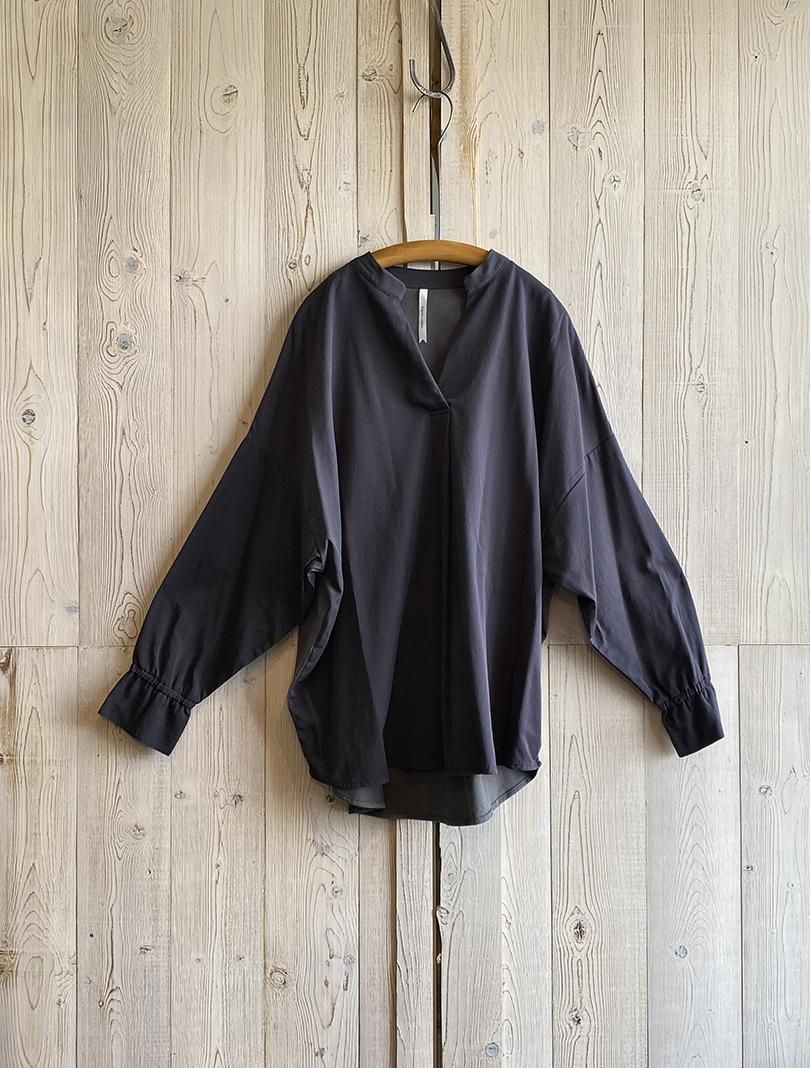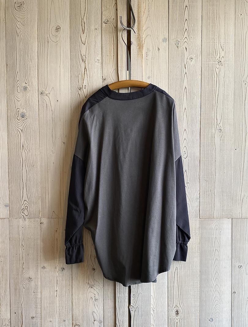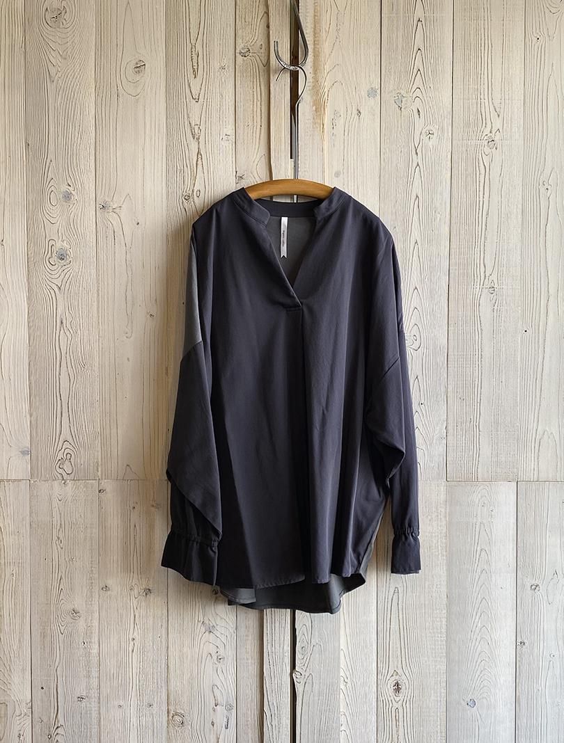ディニエコリエより、後ろ切替長袖BLの襟のブラウスプルオーバーです。色合いも素材も良い感じです。別素材のコットンで前身頃と後ろ身頃の素材違いがカッコいいです。袖のデザインがポイントです。