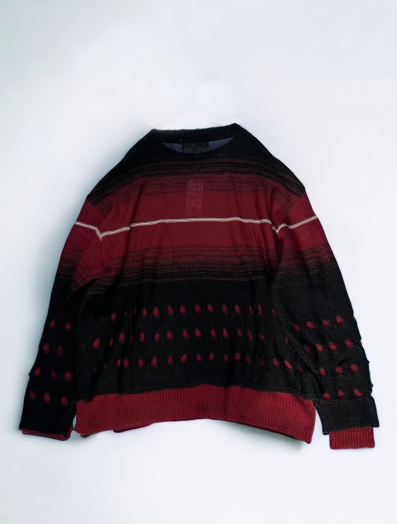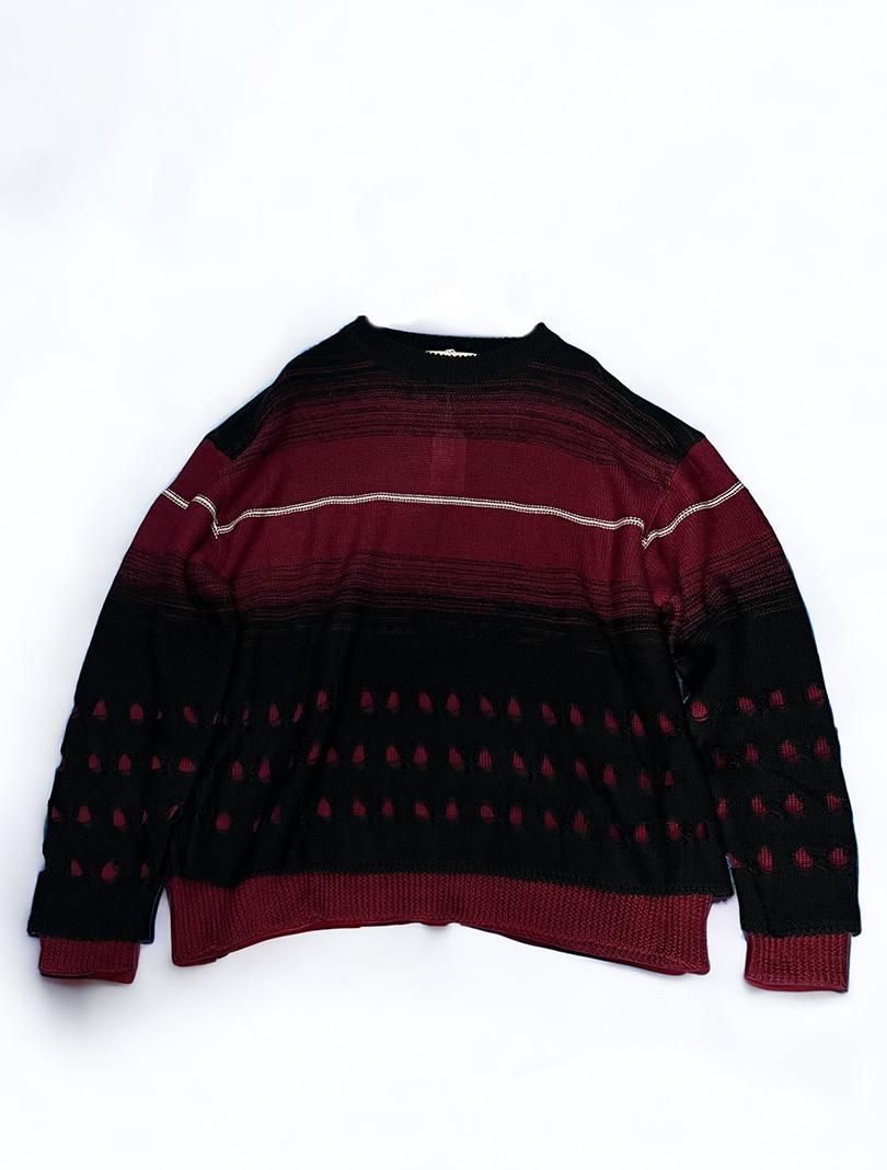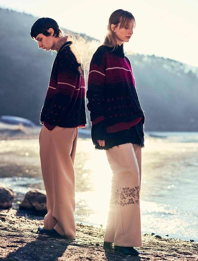 繊細な編み地のニットプルオーバー。水面の境目をイメージしたラインから上が一重、下が二重になっています。袖口や裾をめくり上げることができ、さまざまな着こなしを楽しめます。