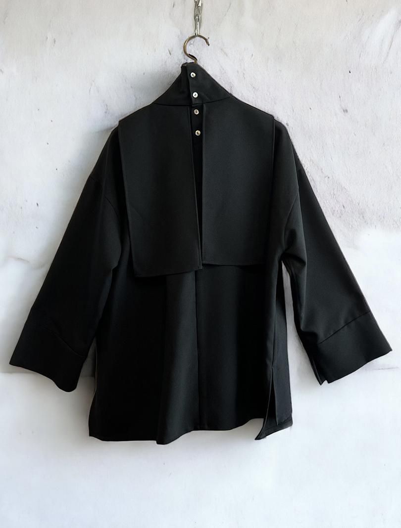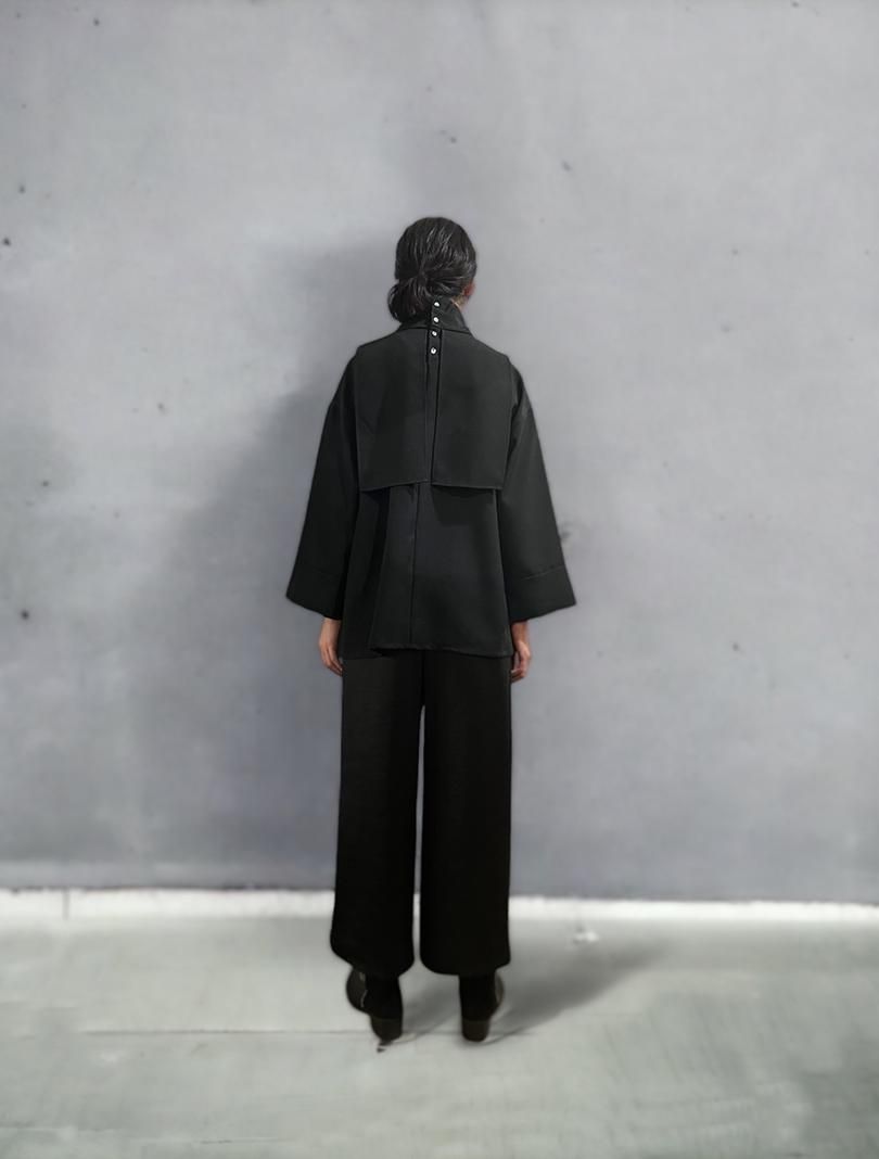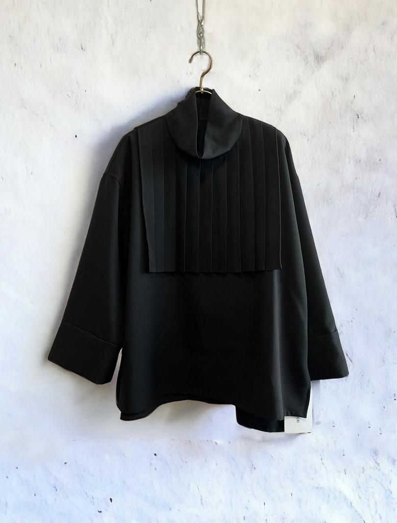 プリーツヨークプルオーバーです。前身頃に施した太いプリーツのヨークが印象的でシックでクラシカルなデザインです。ハイネックでバックネックにボタンが付いているので着脱しやすい仕様で、後ろの首元の雰囲気も美しいです。ヒップの隠れる丈で程よくゆとりのあるサイズ感が特徴。大人のプルオーバーを演出する1枚です。