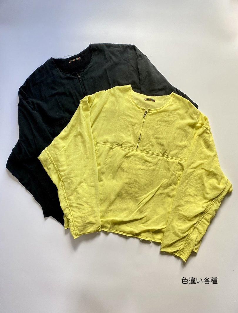 roundabout より、特殊解撚工程を通したことによる糸に膨らみとシャリ感が特徴的な80双のボイルを表に、ソフト加工が施され、シアー感が特徴の天竺を裏にし、2枚の生地を重ね合わせた状態で縫製したプルオーバーです。全体をインサイドアウトで構成してあり、さらには縫い代の端は裁ち切りにしていて、首ぐりと袖口も裾とポケットロを裁ち切りにしています。汚らしく見えることがないように考慮しております。袖口から脇を通って裾までを機能とデザインの双方を活かした作りにしています。布帛とカットを重ね合わせて1枚の生地として縫製し、さらにはウォッシュ加工もかけているためどこにもない独特な風合いに仕上がっています。