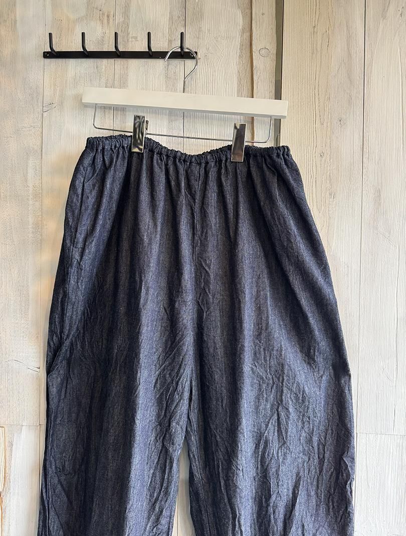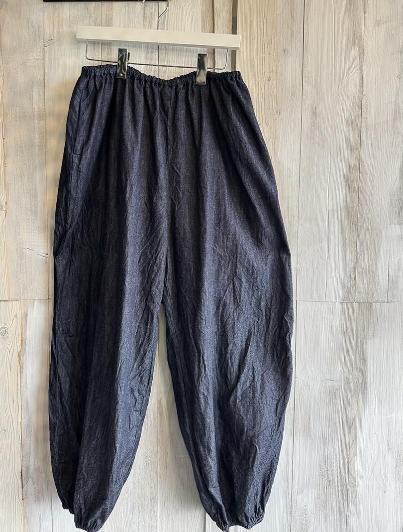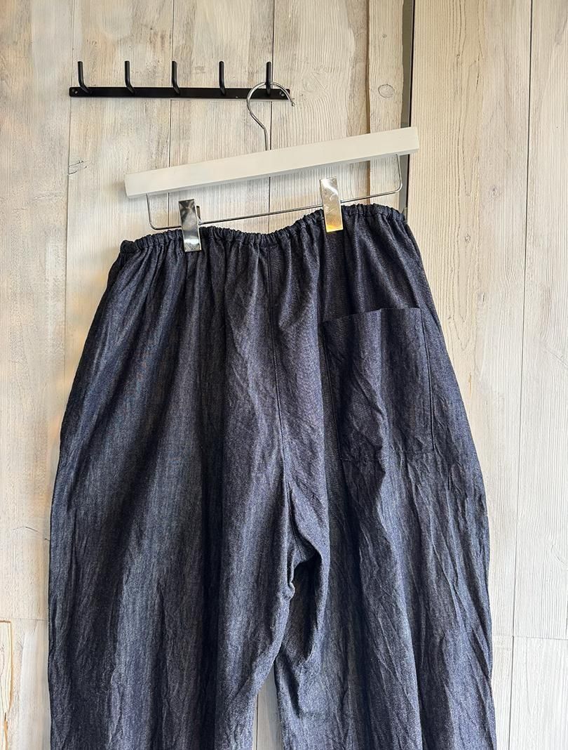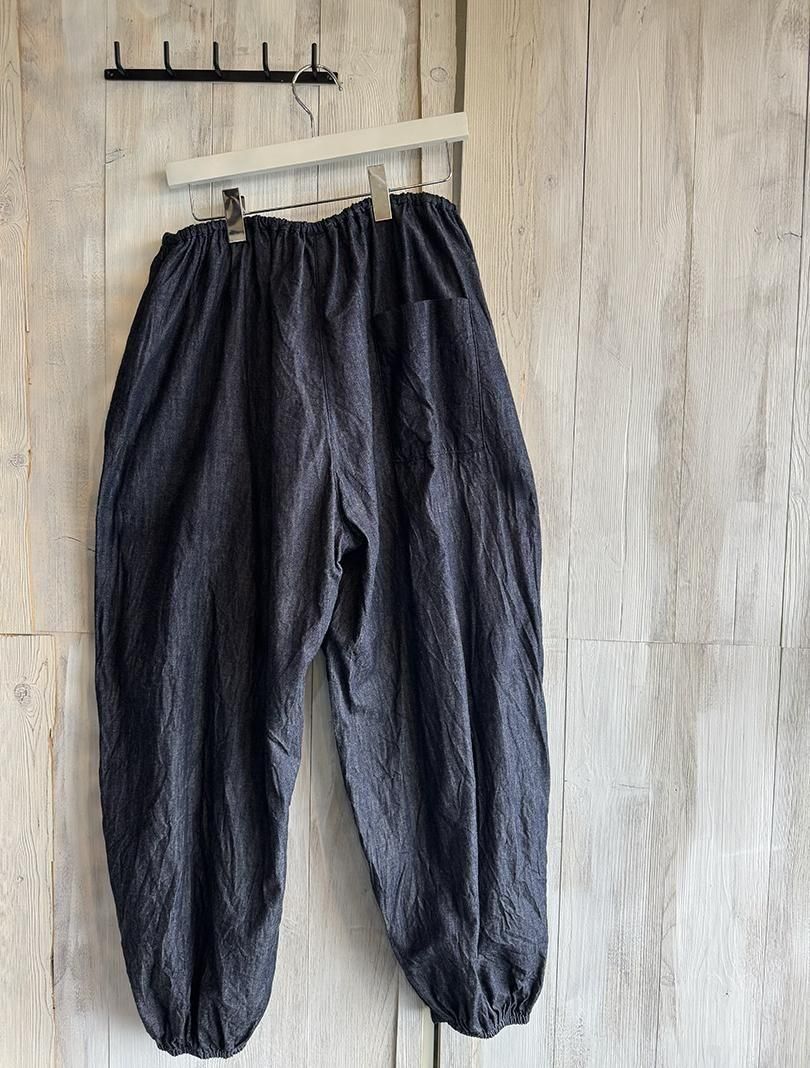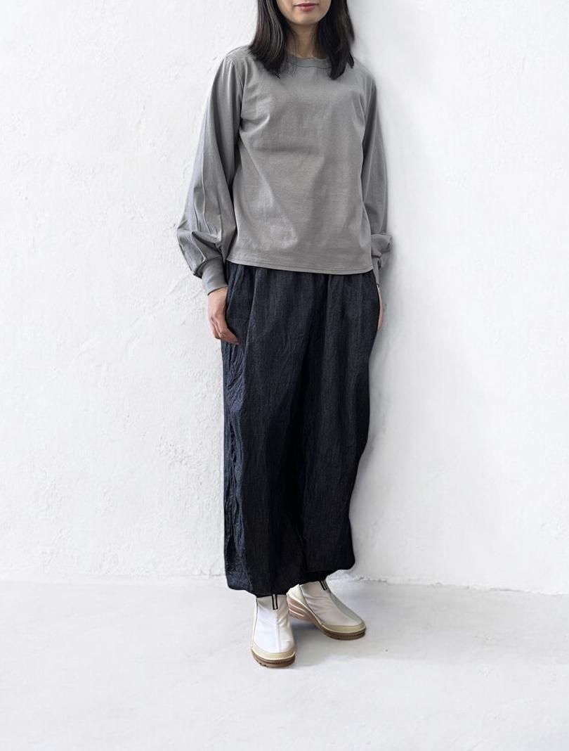 60zデニムを使用したドローストリングボリュームパンツです。裾ゴムを施した丸みのあるシルエットで、ウエストにもゴムに加え中紐付きなのでリラックス感のある穿きやすいデザイン仕上げです。ヒップやわたりもゆったりとしており柔らかいデニム生地なので気軽に着用していただけます。新品の時期は色落ち注意が必要で、お洗濯は別で手洗いをお勧めします。穿き慣れてくると色落ちも心配なくなります。