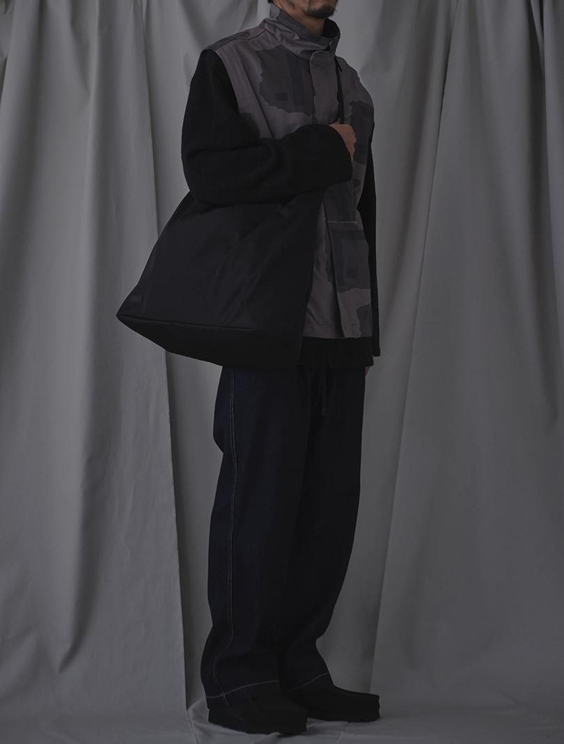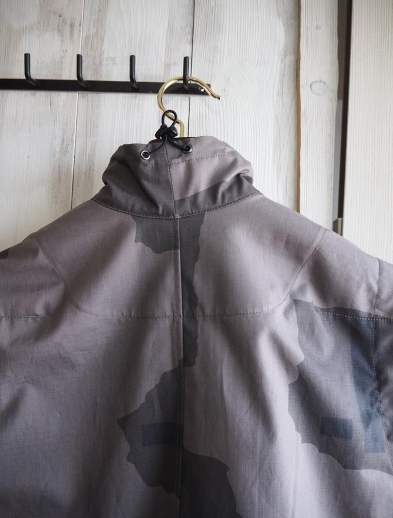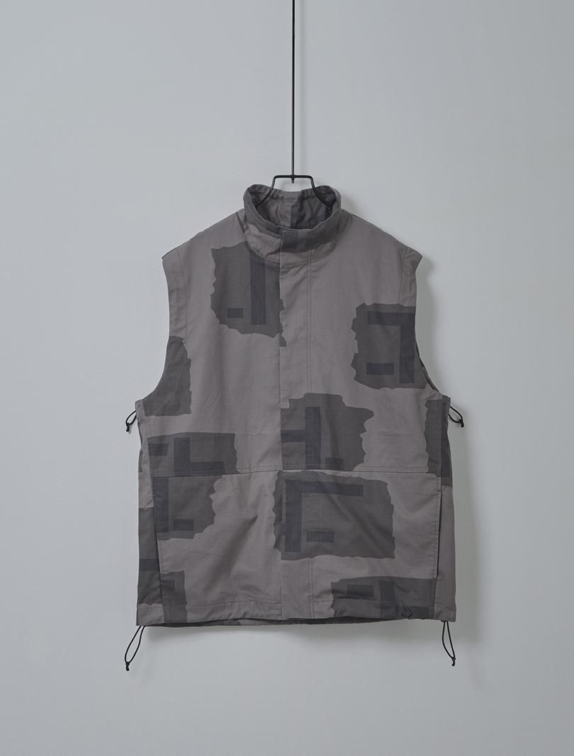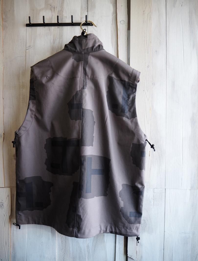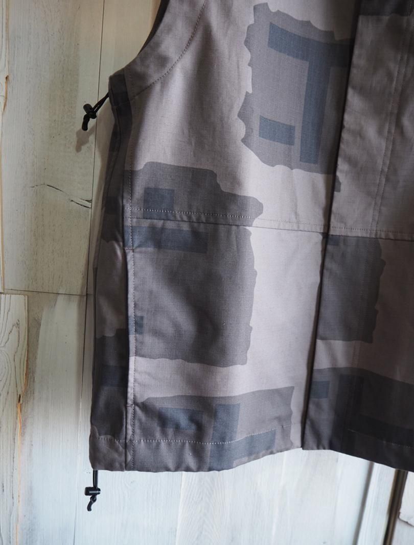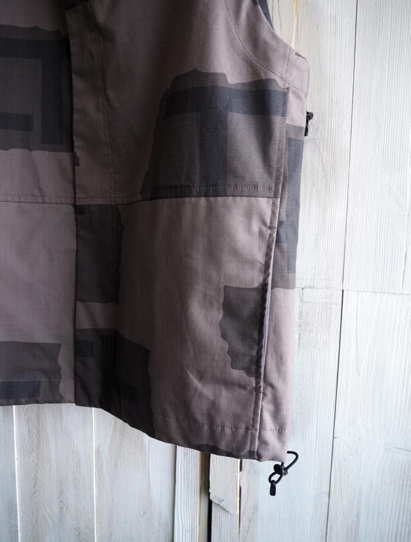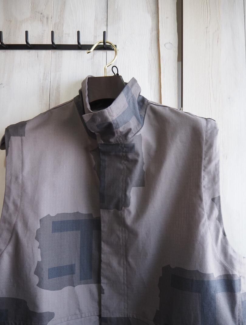 コットンリップストップにテストサンプル程度で生産が終了してしまったTパターンカモをプリントしたファブリックで、Tパターンは1997年に開発され2000年前後まで見かける事が出来ています。アウトドアスタイルのスタンドカラーのベストをベースにミリタリーライクにアレンジしたデザイン。衿やアームホール、裾にドローコードを通しシルエットの変化を楽しめるようになっています。