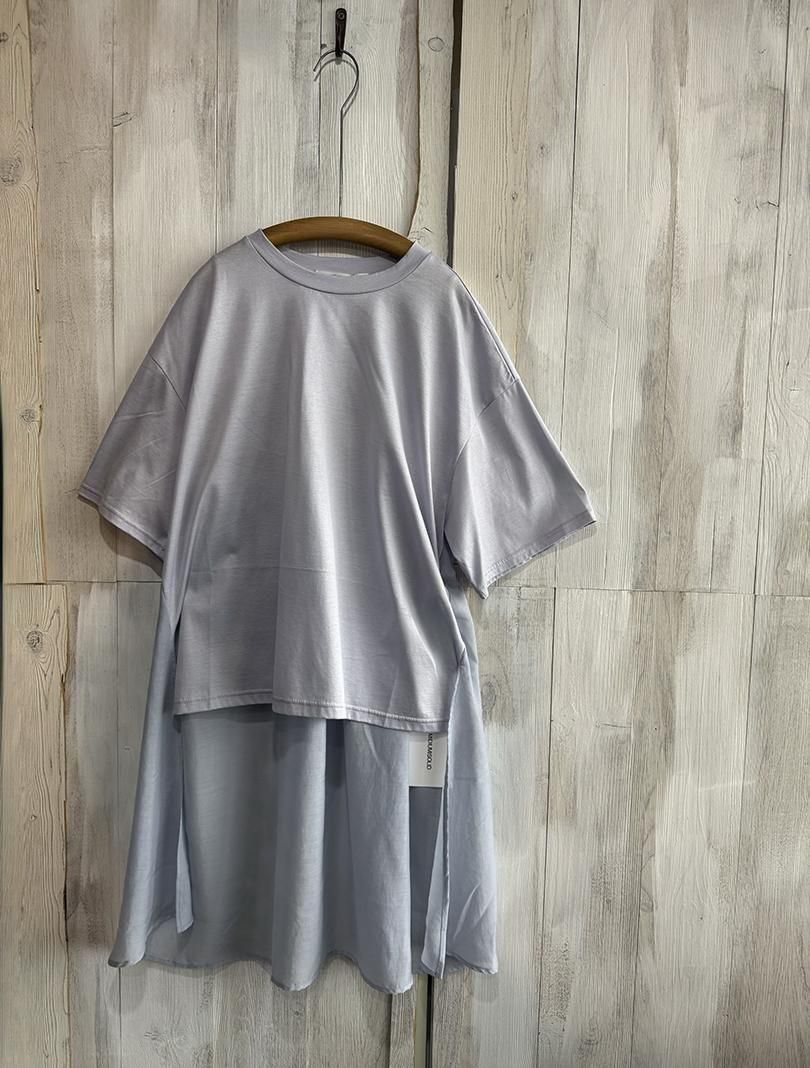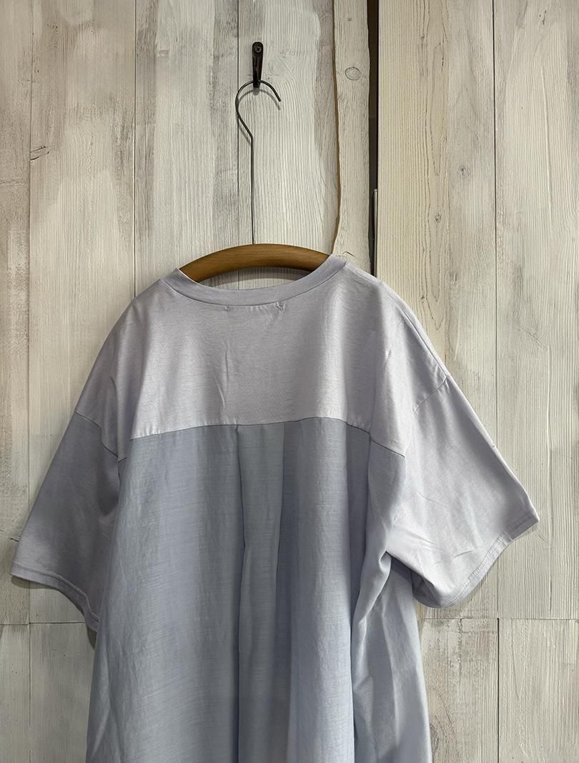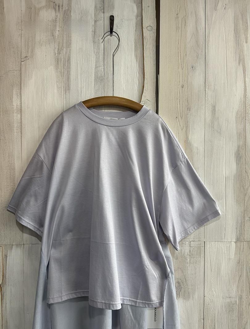 ウーブンコンビTシャツの今季のシリーズです。耐久性のあるカット地と光沢のあるオーガンジーを使用したレイヤードTシャツで大きく前後差を付けた動きのあるシルエットが特徴。シアー素材部分はシワになりにくく軽さがあるのでしなやかにゆれ、優雅さも演出。首元は狭く160cmくらいの方が着用すると、後ろのオーガンジーの丈は腿も下くらいの着丈です。動きのある1枚でも美しいTシャツです。