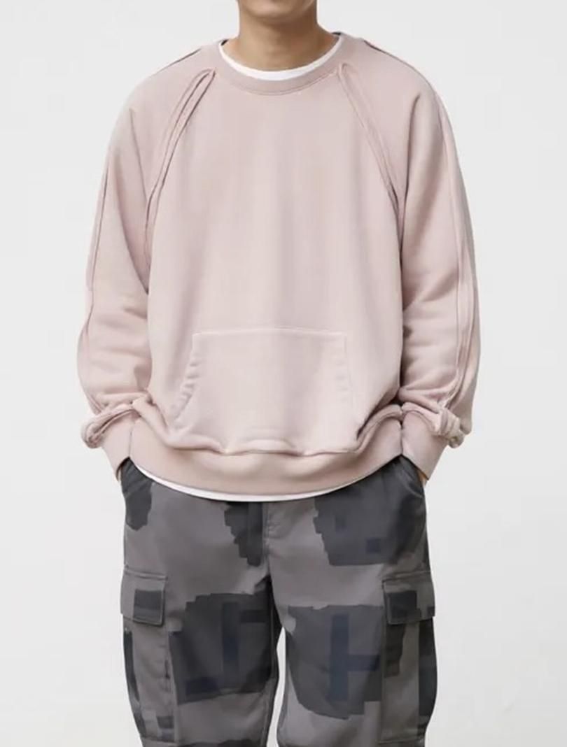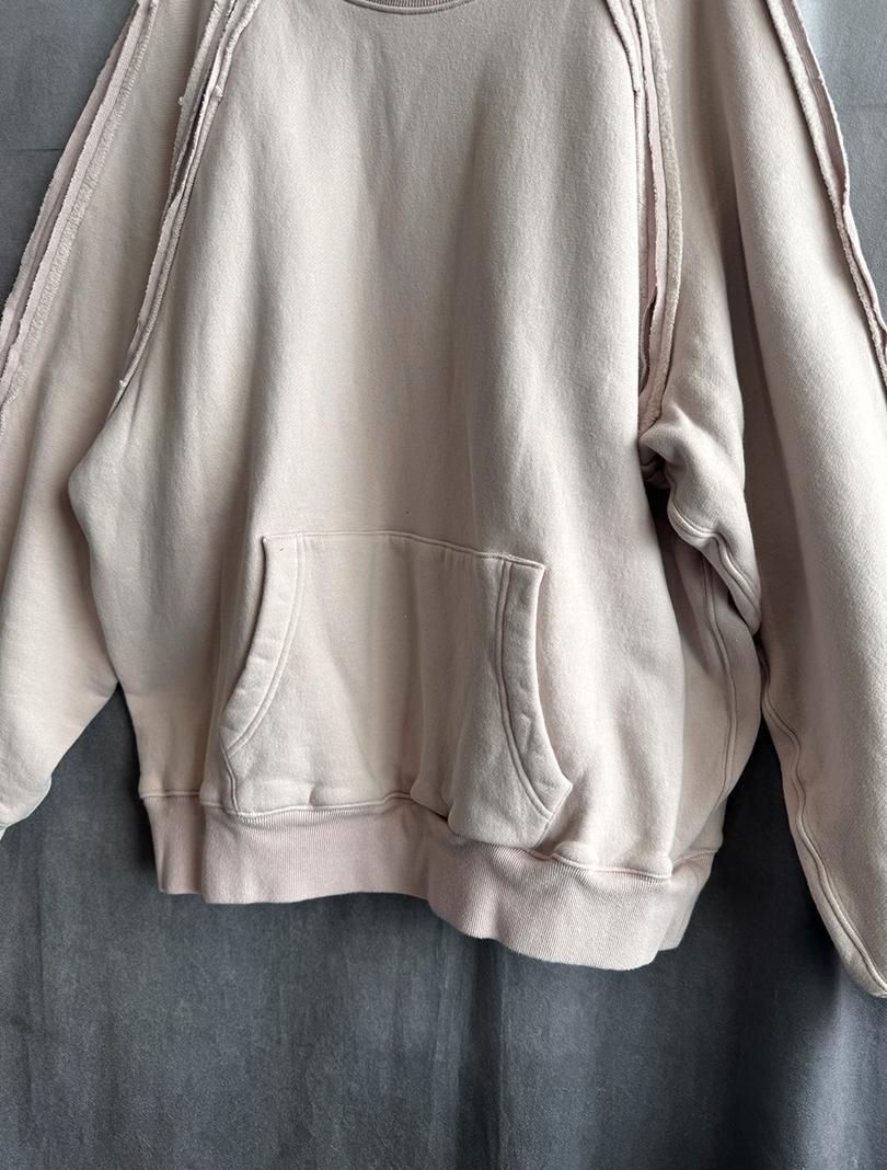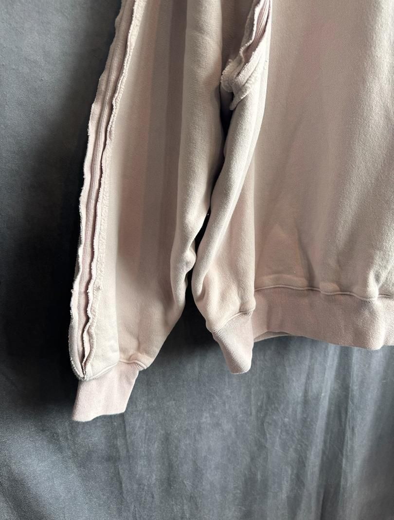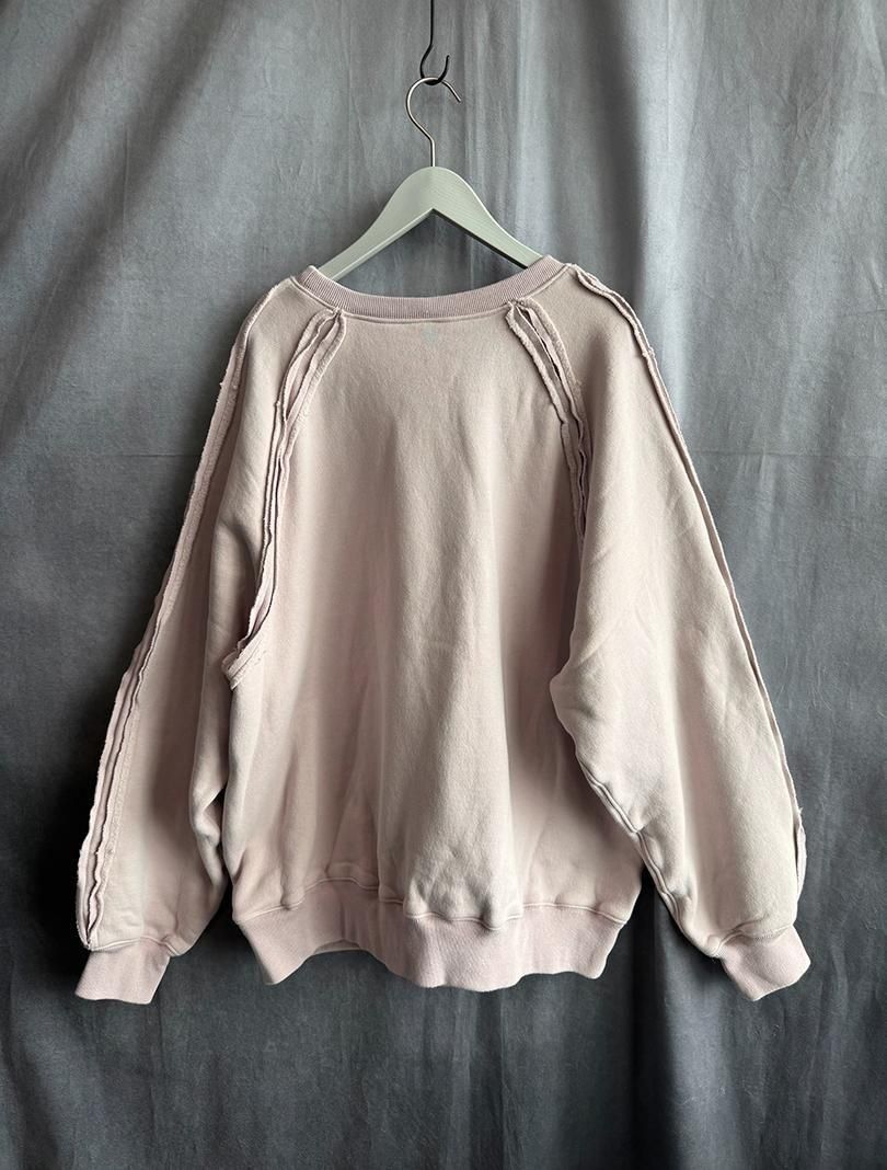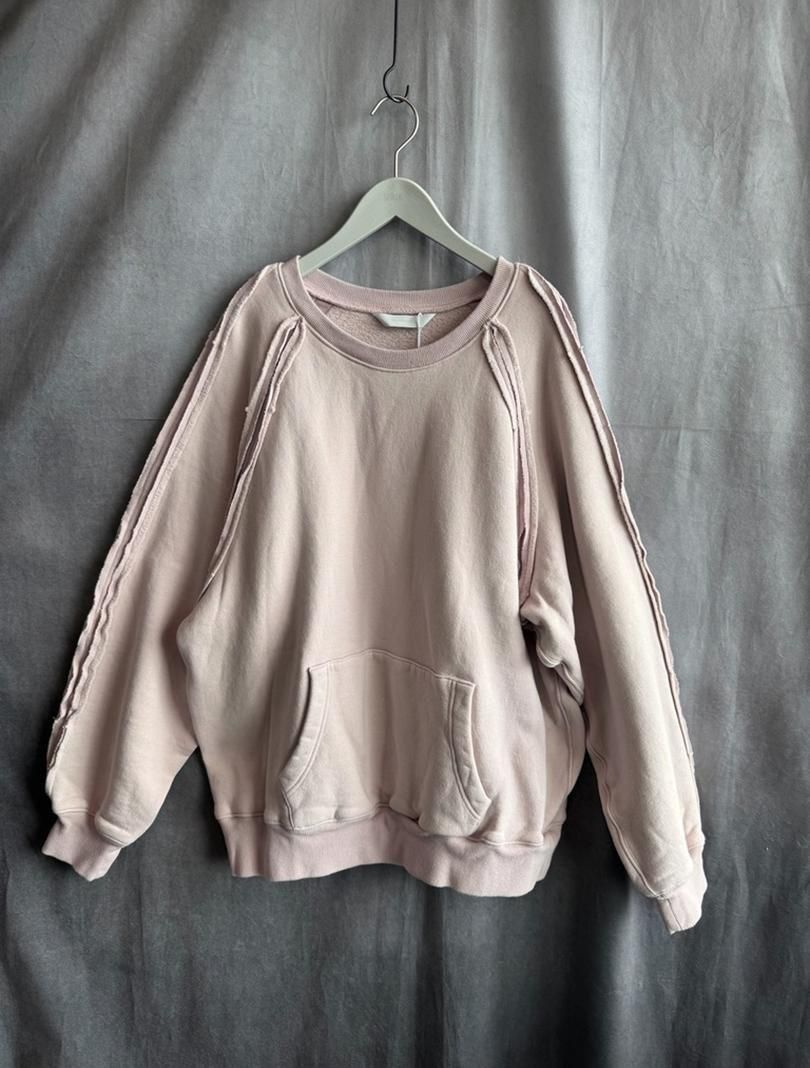 roundaboutより、起毛後に揉み加工等で毛を絡めることにより、通常の起毛に比べて毛抜けしにくく、玉状の凹凸のある独特の表面感が特徴的なナッピング起毛の裏毛を使用したスウェットです。袖ぐりや肩接ぎから袖口を立ち切りにし、裏にフライスを当てることにより可動域を拡げ、着心地も良くなっております。生地を贅沢に使用し、たっぷりとしたワイドなシルエットになっております。カンガルーポケットを付けたのみのcrew neckも袖ぐりや肩接ぎの仕様により、シンプルながら存在感のあるアイテムになっています。燻んだピンクの配色もおすすめです。