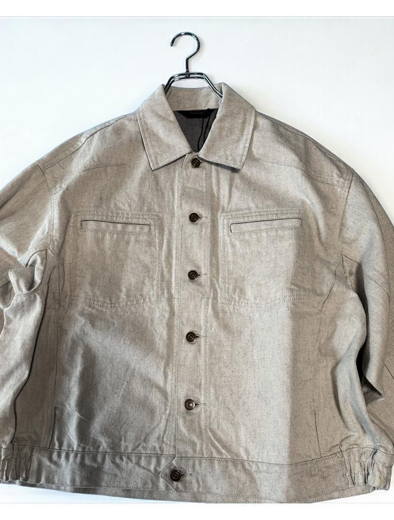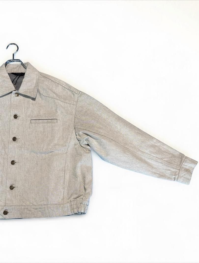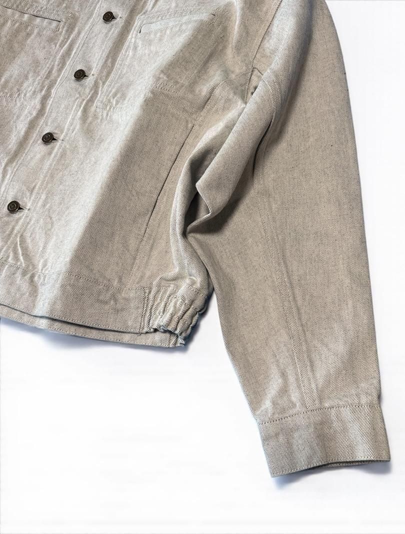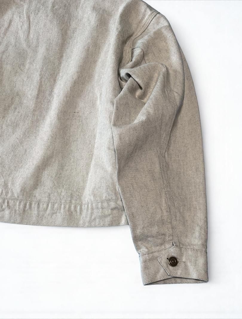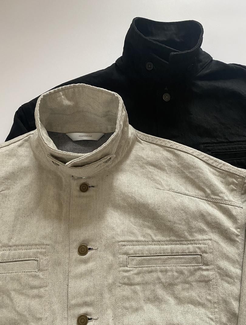 roundaboutより、デニムジャケットです。糸の引き揃え時にテンションが一定でなく、太い部分と細い部分が混在したムラ糸で織り込まれる事で生地に独特の凹凸やムラが生まれる13ozのムラ糸デニムを使用。色落ちの際には、太い部分は色が濃く残り、細い部分は薄くなることで、コントラストのある美しい色落ちを表現する事が出来ます。そのヴィンテージデニムのような特徴のある生地をあえてインディゴは使わず、生成を使い、立体裁断により作り上げたブルゾンです。脇を前身頃と後ろ身頃それぞれで接ぐ形にし、前、後ろ、両脇の4面にて構成し、脇の2本の接ぎがそのまま袖の繋ぎに繋がるようにしました。独特な生地の風合いは惹きつけ魅了するデニムジャケットです。