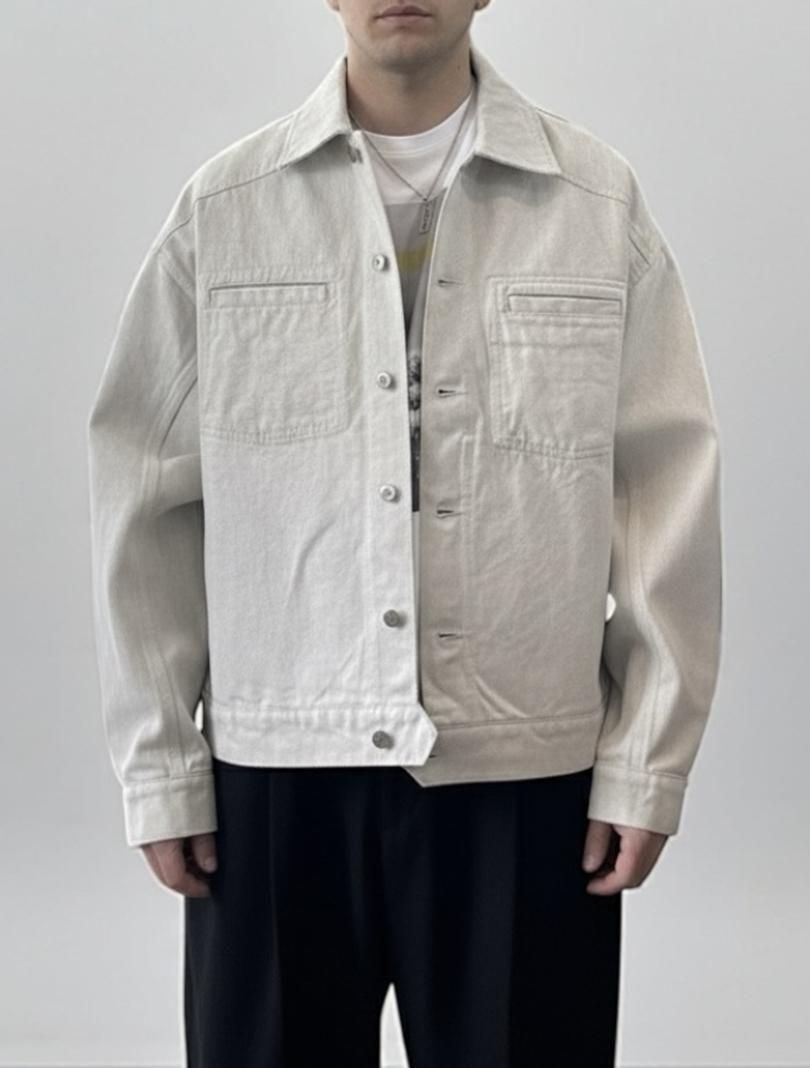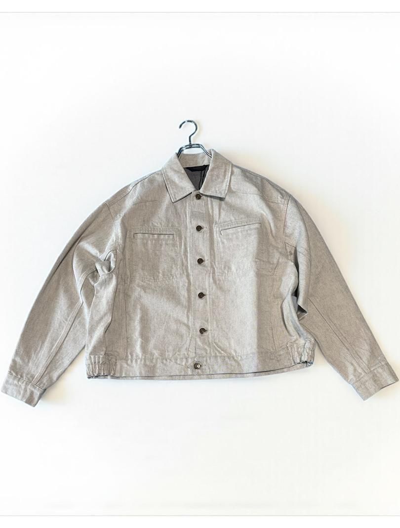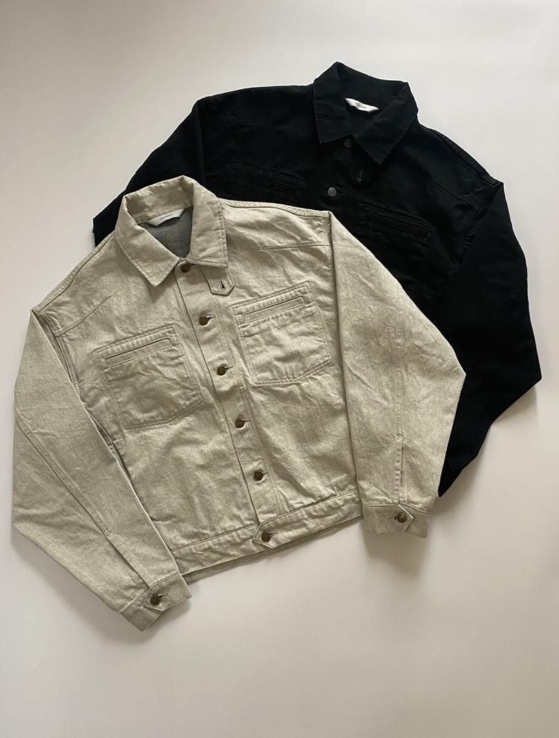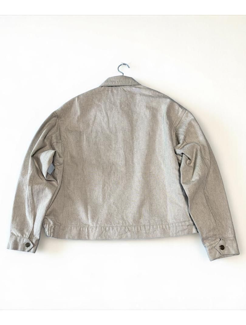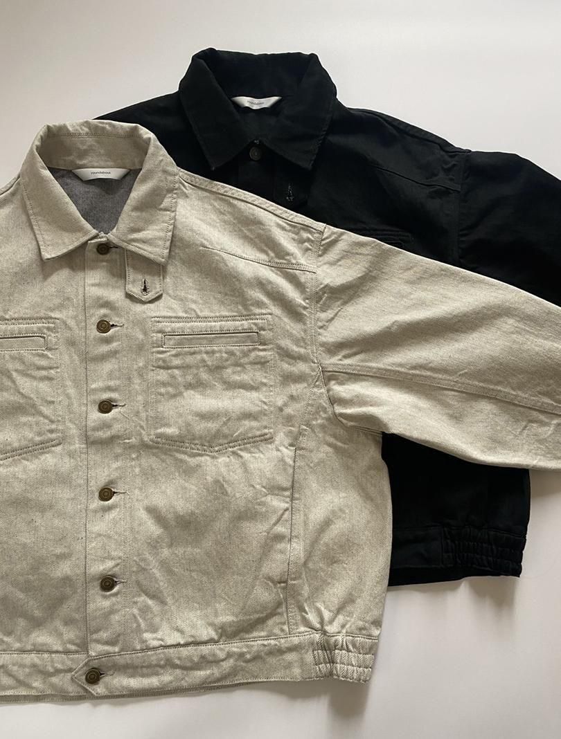 roundaboutより、デニムジャケットです。糸の引き揃え時にテンションが一定でなく、太い部分と細い部分が混在したムラ糸で織り込まれる事で生地に独特の凹凸やムラが生まれる13ozのムラ糸デニムを使用。色落ちの際には、太い部分は色が濃く残り、細い部分は薄くなることで、コントラストのある美しい色落ちを表現する事が出来ます。そのヴィンテージデニムのような特徴のある生地をあえてインディゴは使わず、生成を使い、立体裁断により作り上げたブルゾンです。脇を前身頃と後ろ身頃それぞれで接ぐ形にし、前、後ろ、両脇の4面にて構成し、脇の2本の接ぎがそのまま袖の繋ぎに繋がるようにしました。独特な生地の風合いは惹きつけ魅了するデニムジャケットです。