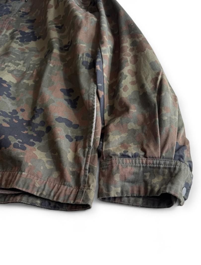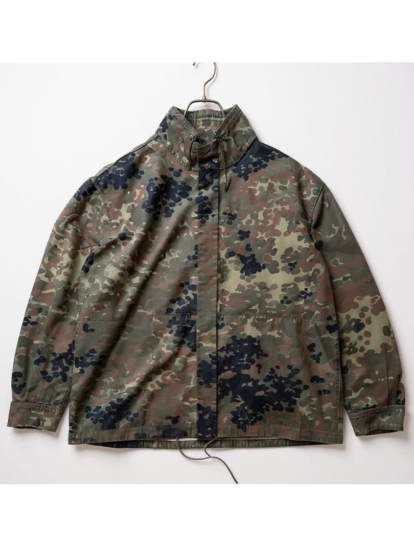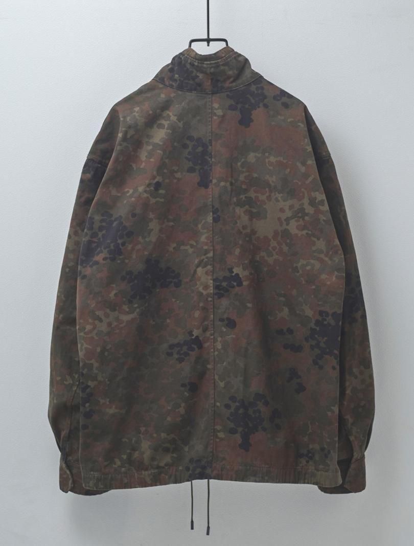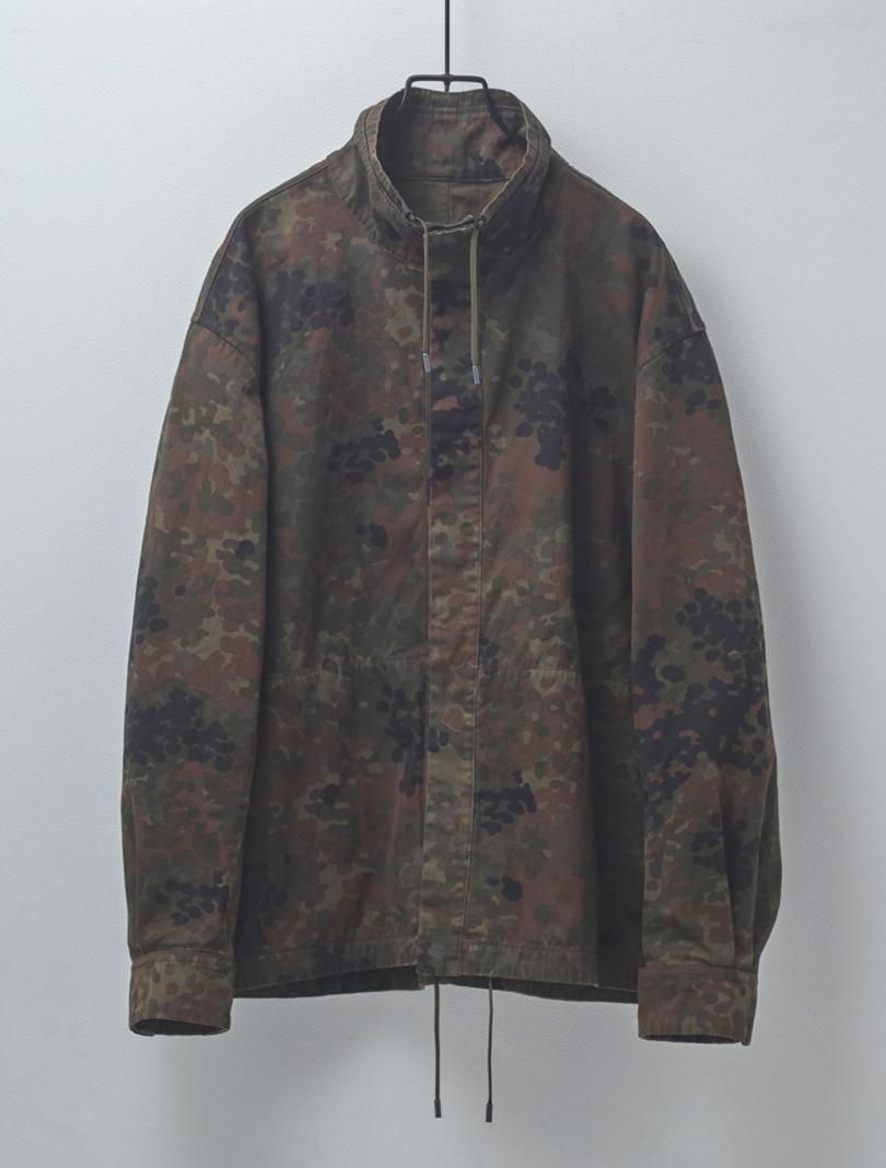 ドイツ軍独特の迷彩パターンである絵の具を垂らしたような柄が特徴的なフレクターカモにオーバーダイを施し落ち着いた表情に仕上げています。USアーミーのジャケットをモチーフにエポレットやポケットなどをそぎ落としソリッドに仕上げた腰丈ブルゾンです。