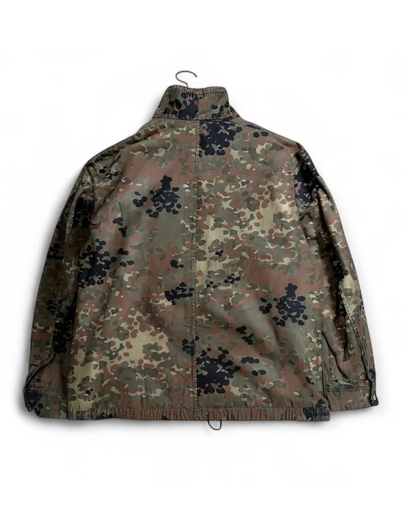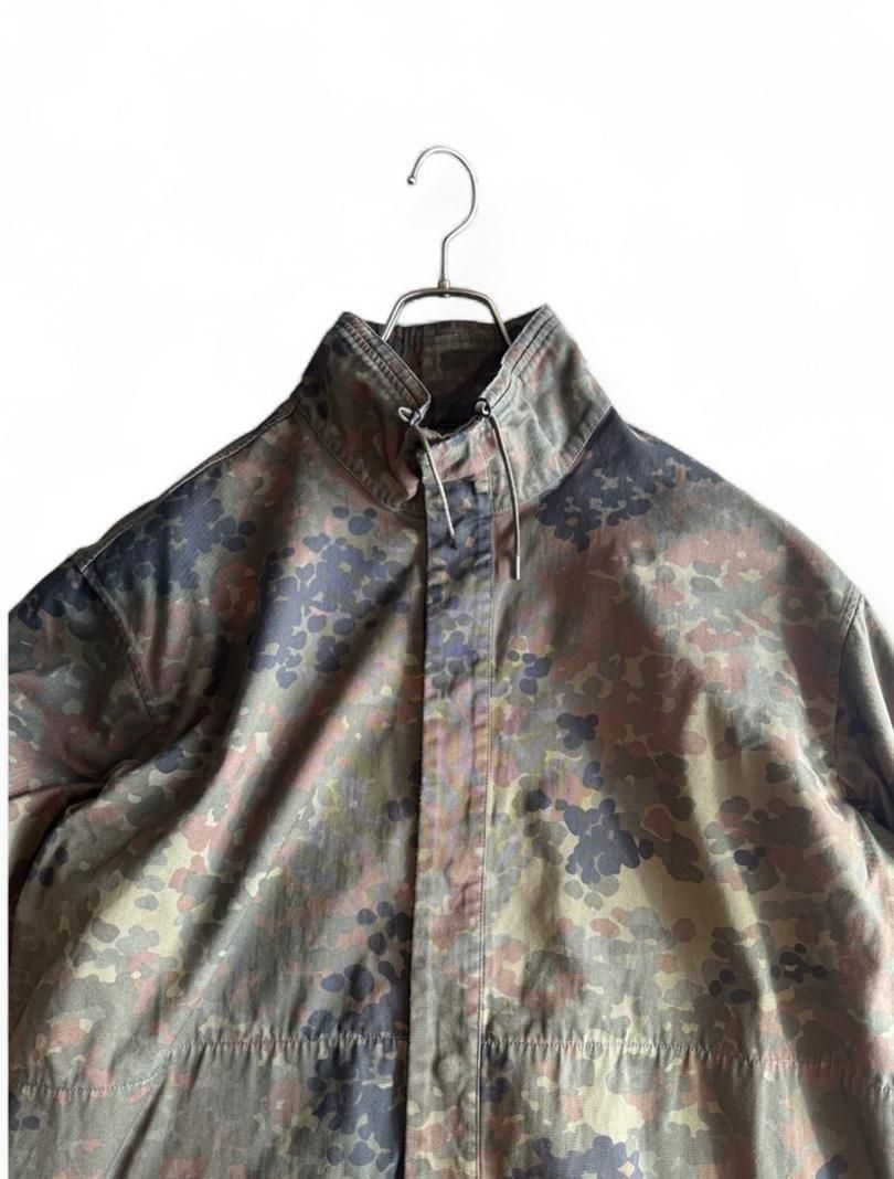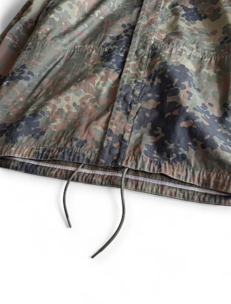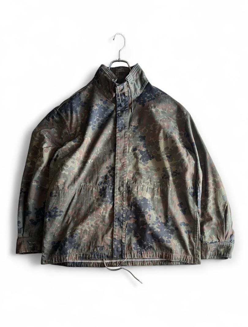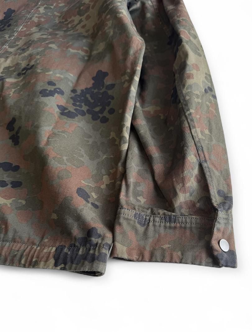 ドイツ軍独特の迷彩パターンである絵の具を垂らしたような柄が特徴的なフレクターカモにオーバーダイを施し落ち着いた表情に仕上げています。USアーミーのジャケットをモチーフにエポレットやポケットなどをそぎ落としソリッドに仕上げた腰丈ブルゾンです。