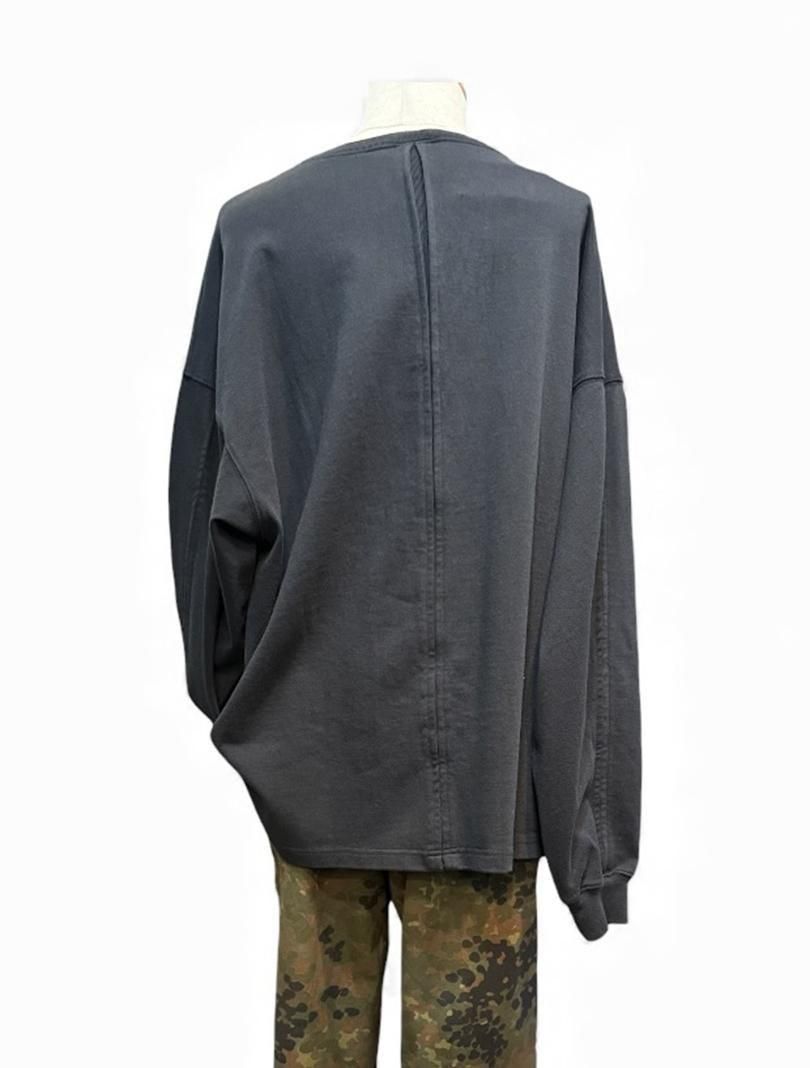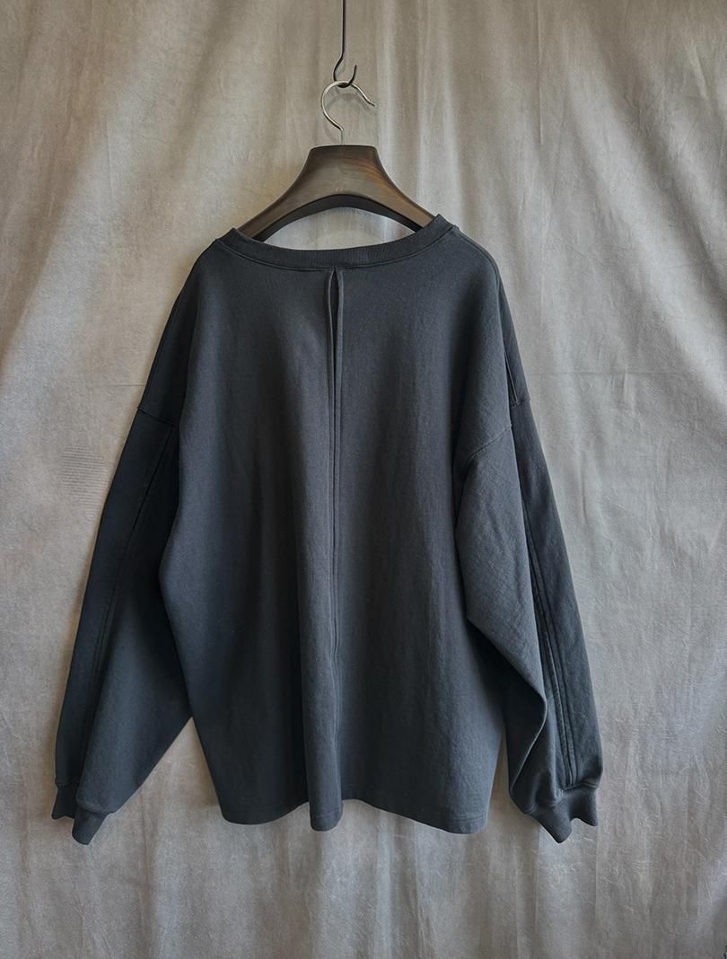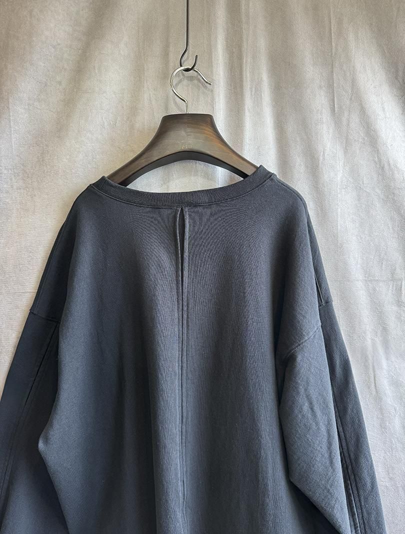空気の力で糸を撚り合わせる特殊な製法で紡がれた糸をひき揃えて度詰めで編んだ天竺を使用したクルーネックTシャツ。生地は表面の肌触りはさらっとしているのに、中心部は柔らかいという特徴があります。箇所によってプリーツ同士を向かい合わせ、裏にフライスを当てることによって可動域を拡げるといった「機能」と、その箇所自体が特徴の1つとなる「デザイン」の両方を意識したものになります。脇の接ぎをなくし、センターバックのみに接ぎを入れる事で丸胴の身頃を完成させた。丸胴にするために吊り編み機を使用すると身頃の幅が限定されてしまうため、それを解消し、さらには機能的な身頃と袖の仕様になっています。